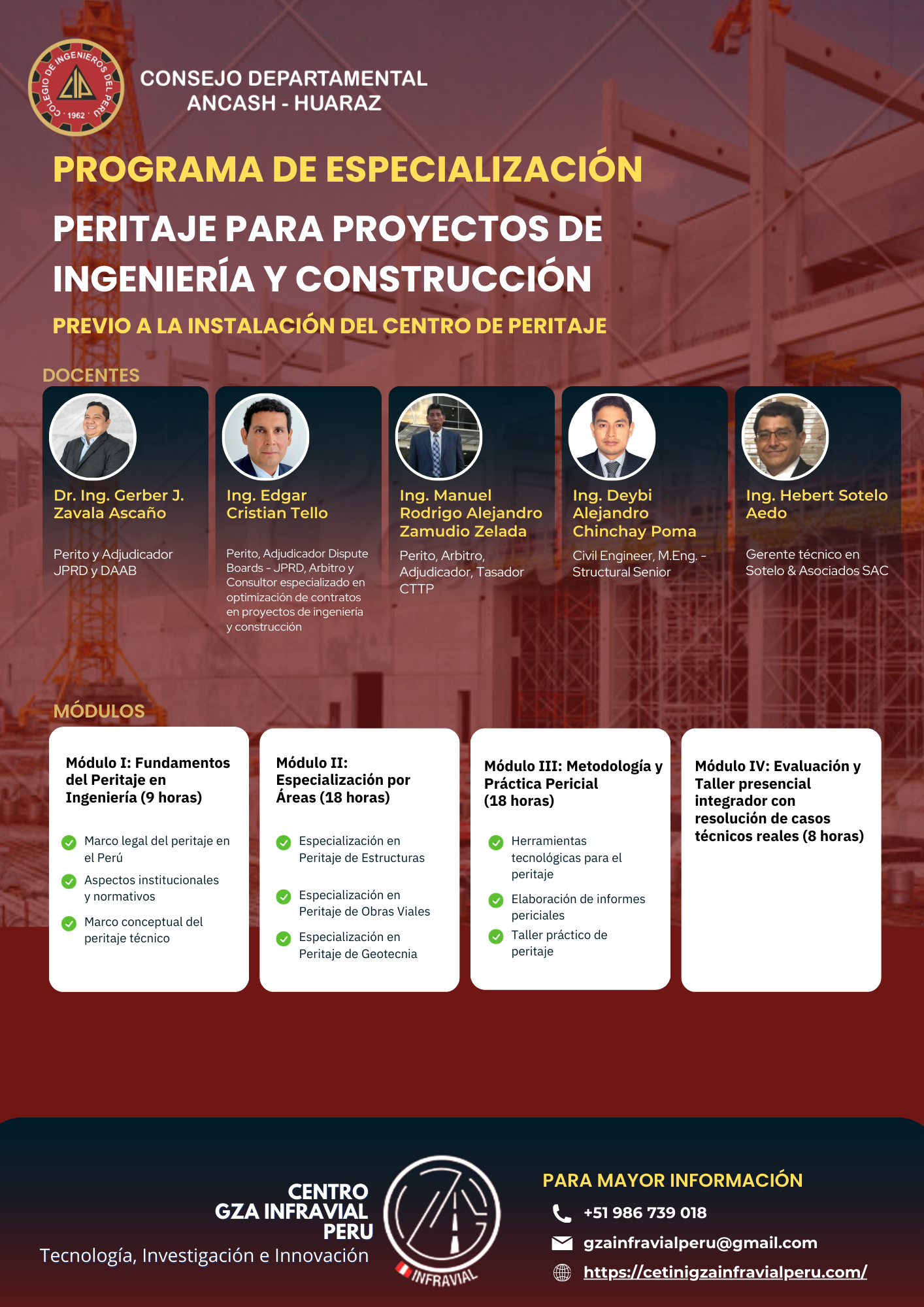 Domina las herramientas, metodologías y enfoques técnicos más actuales para participar como perito en proyectos de ingeniería y construcción. Incrementa tu competitividad profesional y conviértete en un especialista certificado por el Colegio de Ingenieros del Perú y el Centro GZA Infravial.